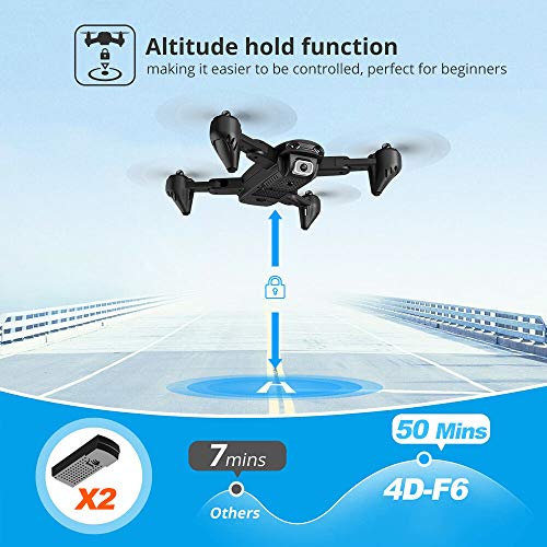 【Foldable & 2 Batteries Rechargeable】:Lasts 60 Mins. Both drone arms and propellers are foldable. Made of solid material There can always be surprises on the journey with 4DF6. Help you take great selfie or panoramic views looking down from the sky. Explore the word with the help of it! Unfolded:12.9*12.9*2.3in / Folded: 7.0*4.7*2.3in