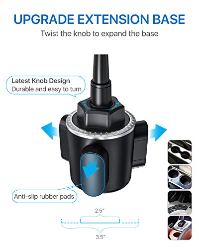 LATEST ADJUSTABLE BASE DESIGN: Andobil cell phone cup holder for car adapts the knob-type base covered by anti-slip rubber pads, which perfectly fits 2.5-3.5in diameter cup holders in your vehicle, securely holds your phone without shaking or wobbling.And the latest hexagonal knob design ensures the smooth twisting experience,easier than open bottle caps.