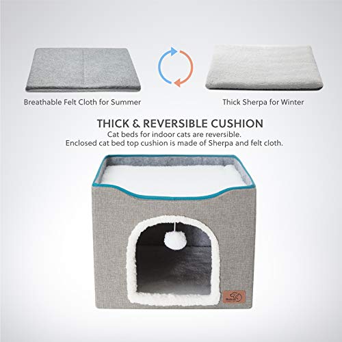 Enlarged Cave & Funny Ball: Pet beds for cats inside allow cats to sleep curled up. 7” large size hole ensures cats of different sizes easy entry and exit. The plush ball hanging of the cat cubes for indoor cats in the cut add to the cat’s entertainment.