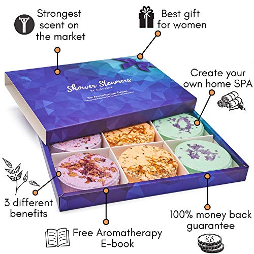 🧘 SMELLS AH-MAZING! Just ask the thousands of women who have melted away stress with our Shower Steamer Aromatherapy BREATHE AND RELAX Pack. Because we use only pure essential oils and nature identical fragrance, you get the true benefits of aromatherapy. Set includes 6 Shower Melts: 2x Watermelon for Relaxation, 2x Grapefruit for a Refreshing Burst and 2x Menthol & Eucalyptus for Sinus Congestion.
