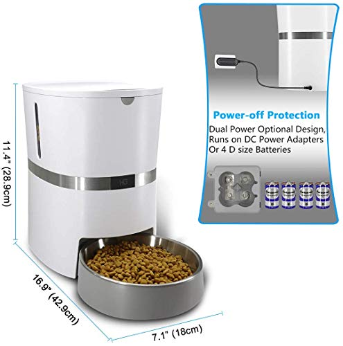 【Unique Infrared Detection Design】A built-in infrared sensor alerts when the food stuck in the feeder, the motor will rotate oppositely to release food to prevent the food from blocking.The automatic cat feeder is powered by power adapter and 4 D-size batteries. In case of power outage, the feeder will continue to function on 4 D-size batteries to assure your pet never miss a feeding. (Batteries are NOT included)