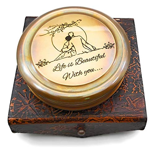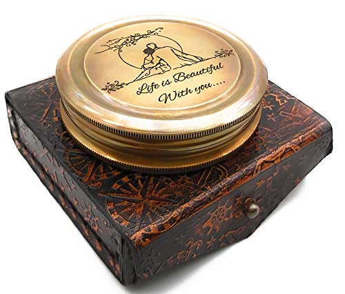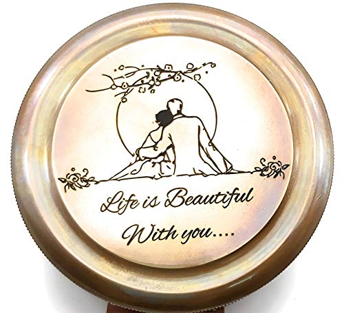 “Life is beautiful with you” with couple sitting is beautifully engraved on compass lid top side.