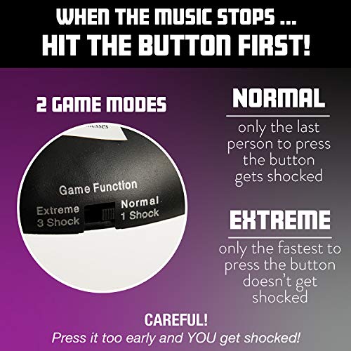 HOW IT WORKS: Each player grabs a handle from the base. Press the button in the center, watch the red light blink and listen to the suspenseful music play. Wait for it…..when the red light turns green GO. Press the trigger button as quickly as possible. Be the last to react and get the electric shock.