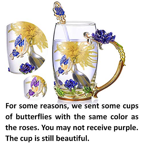 Tea Cup Glass Coffee Mugs Enamel Rose Flower Butterfly Drinking Cups with Spoon Set Unique Gifts for Birthday Wedding…